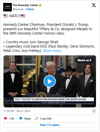 The honorees were formally recognized in a special Oval Office ceremony ahead of the annual gala at the John F. Kennedy Center for the Performing Arts in Washington, D.C., cementing Strait’s place among the most respected figures in the performing arts.