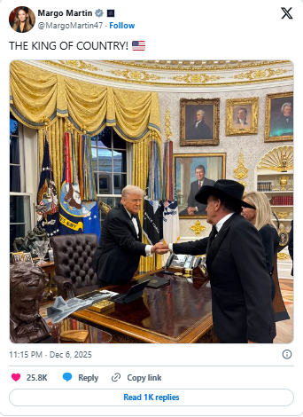 On December 6, 2025, George Strait and the other honorees gathered in the Oval Office for an intimate ceremony with President Donald J. Trump. During the event, Trump presented each recipient with newly redesigned medallions by Tiffany & Co..