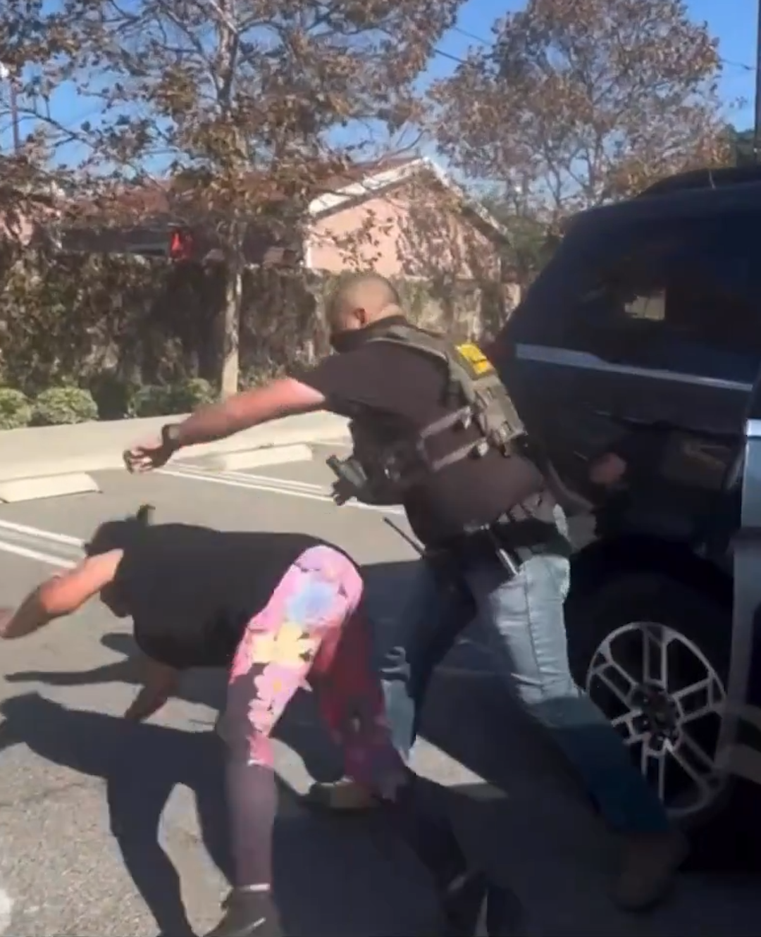 In the clip, a woman can be seen trying to open a vehicle door while agents are mid-arrest. Moments later, she’s restrained and taken to the ground by one of the officers. Officials have not released full details about the individuals involved or what led to the confrontation.