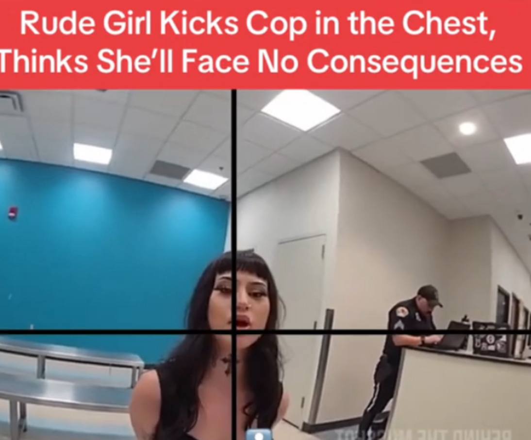 In a scene that quickly turned chaotic, a young woman’s bold defiance against law enforcement has gone viral after she was caught on camera kicking a police officer directly in the chest. What makes this story explode across social media isn’t just the shocking act itself, but her bizarre belief that she could walk away