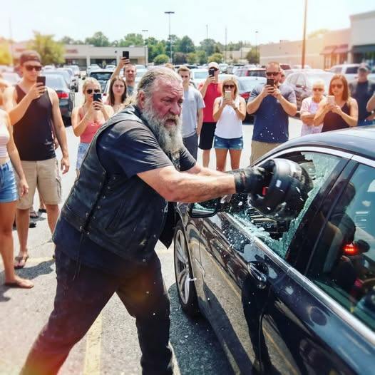 The biker was massive. Leather vest, gray beard, tattoos covering both arms. He parked next to a black BMW, killed the engine, and just stared at the car.Then he got off, pulled a tire iron from his saddlebag, and swung it straight through the driver’s side window. Glass exploded everywhere.