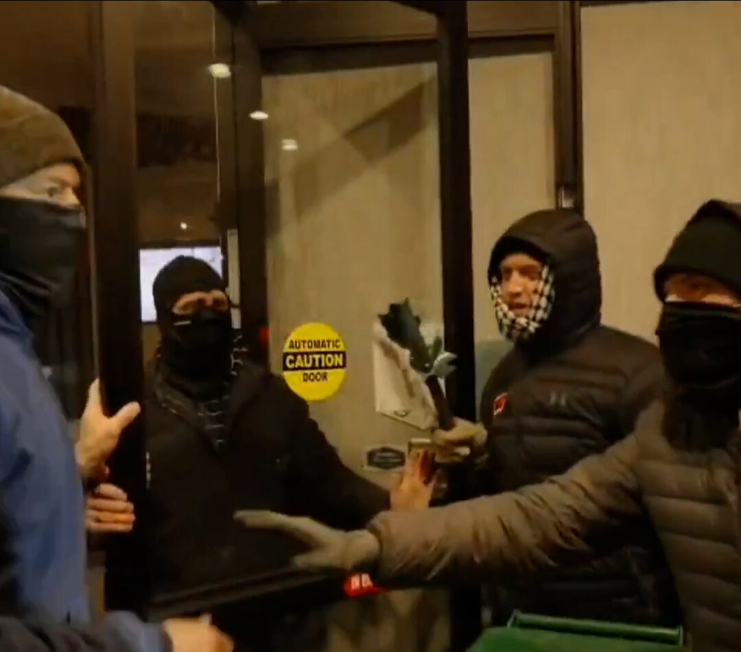 Video and eyewitness reports show demonstrators smashing windows, vandalizing the lobby and spray-painting slogans such as “ICE OUT,” “ICE KILLS” and profanity on the hotel’s exterior. Several people were seen pushing into the lobby area and attempting to breach the entrance, prompting occupants to use vending machines and furniture to block access.