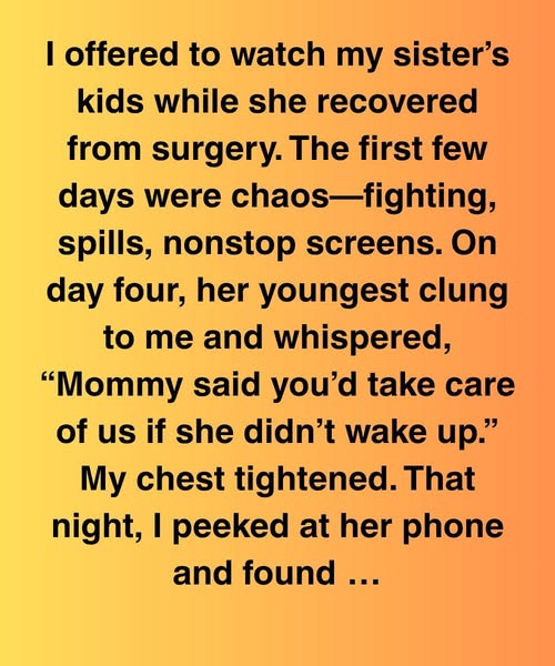 The first few days were complete chaos—sibling fights, spills, constant screen time. But on the fourth day, her youngest clung to me and whispered, “Mommy said you’d take care of us if she didn’t wake up.”