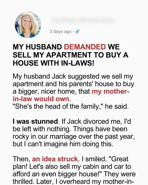 It all began with a smile—Jack’s trademark expression, polished and charming, the kind of smile that had once swept me off my feet but, over time, had started to feel more like a mask. One evening, he sat across from me at the kitchen table, folded his hands like a man with a grand vision, and said, “Honey, I’ve been thinking. What if we sell your apartment and my parents’ house? We could combine the money, buy something bigger, something better. A real family home—one my mother can own. She is the head of the family, after all.”