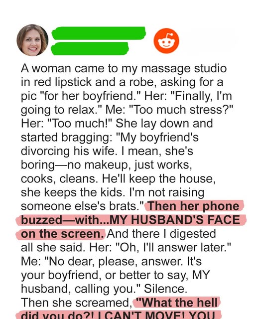 You never think it’ll happen to you. I thought my husband and I had built a life that no one could touch. Then one day, a beautiful young woman walked into my massage studio, casually talked about her life, and left me questioning everything I thought I knew. By the time she realized who I was, it was too late.That day started like any other. My life revolved around my two boys, Ethan and Leo, ages 10 and 8, who kept me busy with school runs, soccer practices, and bedtime routines. I loved being their mom, but my life wasn’t all about them. Five years ago, I opened a massage studio that quickly became my second home. Helping people relax gave me a sense of fulfillment, and I poured my heart and soul into the business.Then there was Henry, my husband of 12 years. When we first met, I was vibrant and full of energy. I’d dress up for him, spend time on my hair, and make an effort to keep the spark alive. Over time, as kids and responsibilities took center stage, I stopped prioritizing those little things. I thought Henry understood. He never complained, and he seemed like the perfect partner—always present for the kids, never missing a birthday or anniversary.