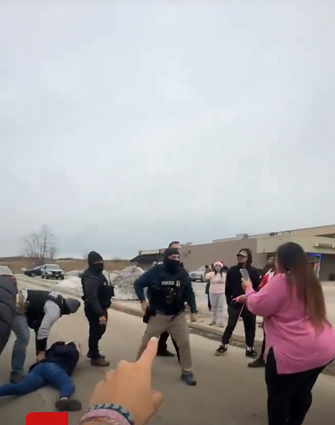 Video from the scene shows agents surrounding a man during an enforcement action as protesters and local residents move closer, shouting and filming the encounter.