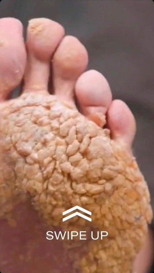 A bizarre photo circulating online shows what appears to be an extreme case of a rare skin condition affecting the bottom of the foot. The unusual growths, which look almost like hardened scales or clusters, have sparked debate among doctors and social media users alike.
