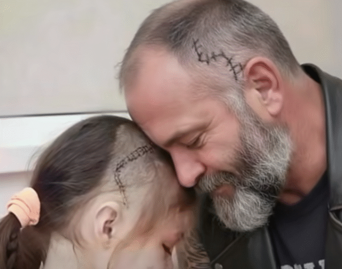 I have been a pediatric nurse for two decades, and I’ve met many brave young patients, but little Lily will forever stay in my heart. She had just gone through her third major brain surgery in half a year. The doctors were hopeful and the tumor was finally gone, but Lily was left with a long scar and a row of delicate staples along the side of her head. When she saw her reflection for the first time, she burst into tears and hid beneath her hoodie, refusing to let anyone near her. At only seven years old, she believed her scar made her different in a way she feared the world could never accept.Her mother did everything she could to comfort her. She whispered gentle reassurances, reminded Lily how strong she was, and held her close every time fear overwhelmed her. But still, Lily kept her hood up and her hands tight around the edges, as if the fabric could shield her from every worried glance. She wouldn’t eat, wouldn’t smile, and wouldn’t allow the medical team to check her stitches. She didn’t feel like a survivor — she felt like she had lost a part of herself.That’s when I thought of Gabriel, one of our hospital volunteers. He was a retired veteran who rode a motorcycle and had a presence that could fill a room — strong, quiet, and unexpectedly soft-hearted when it came to children. More importantly, he carried a scar of his own, one that traced the same path across his temple as Lily’s. When I called him and explained the situation, he arrived without hesitation. He stepped into Lily’s room gently, his voice warm and steady as he introduced himself and praised her courage. And when she still hid her face, Gabriel slowly removed his own bandana and turned his head, showing her his scar, worn and healed with time.The moment Lily lifted her hood and saw someone strong and kind who looked just like her, everything changed. Her eyes widened — not in fear, but in recognition. Gabriel told her that scars mean a person has fought a hard battle and won. Little by little, she let her hands fall away and allowed the doctors to check her staples. That afternoon, she ate her first meal in days and even smiled. Watching her sit a little taller, no longer hiding, reminded us all that healing isn’t only about medicine; it’s also about seeing hope reflected in someone else. Sometimes, the bravest thing in the world is learning to see our scars as symbols of strength, not flaws — and that day, a biker with a gentle heart helped a little girl rediscover hers.